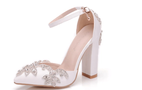 Sapato branco em couro sintético com aplicação em strass, salto grosso super confortável.